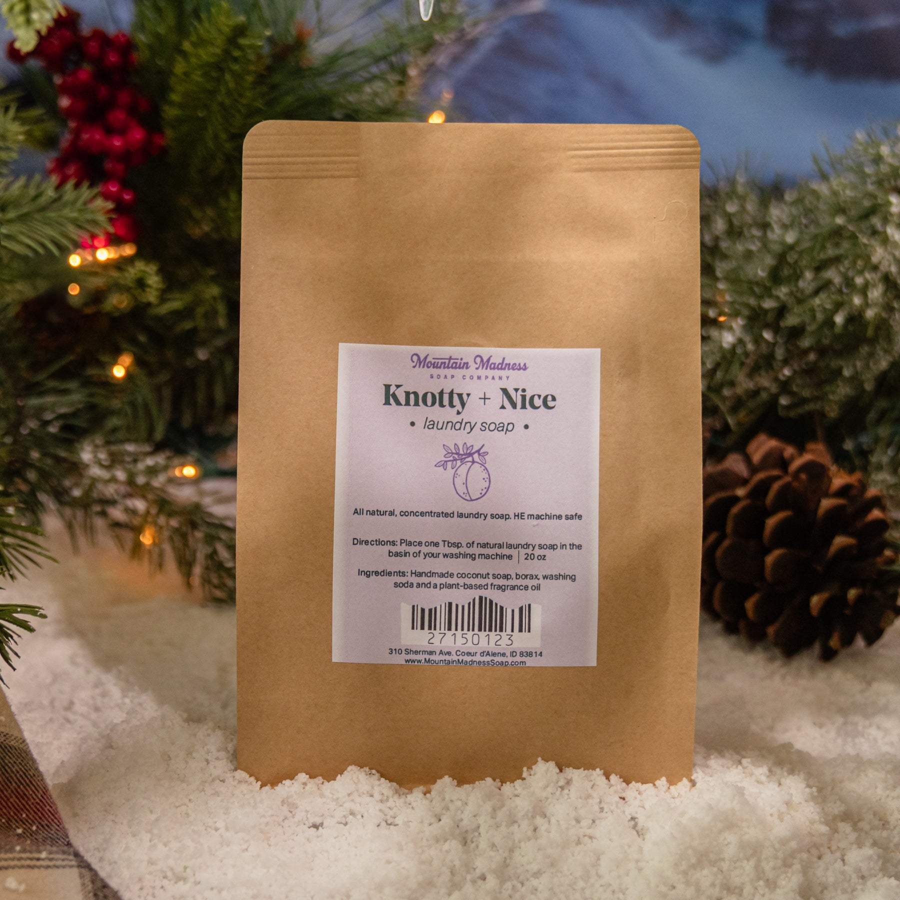 Our Knotty & Nice Laundry Soap combines bright notes of spruce and pine with the soft sweetness of plum and sugar. The result is a fresh, balanced fragrance that makes every load smell like winter in the wood; clean, crisp, and irresistibly comforting.